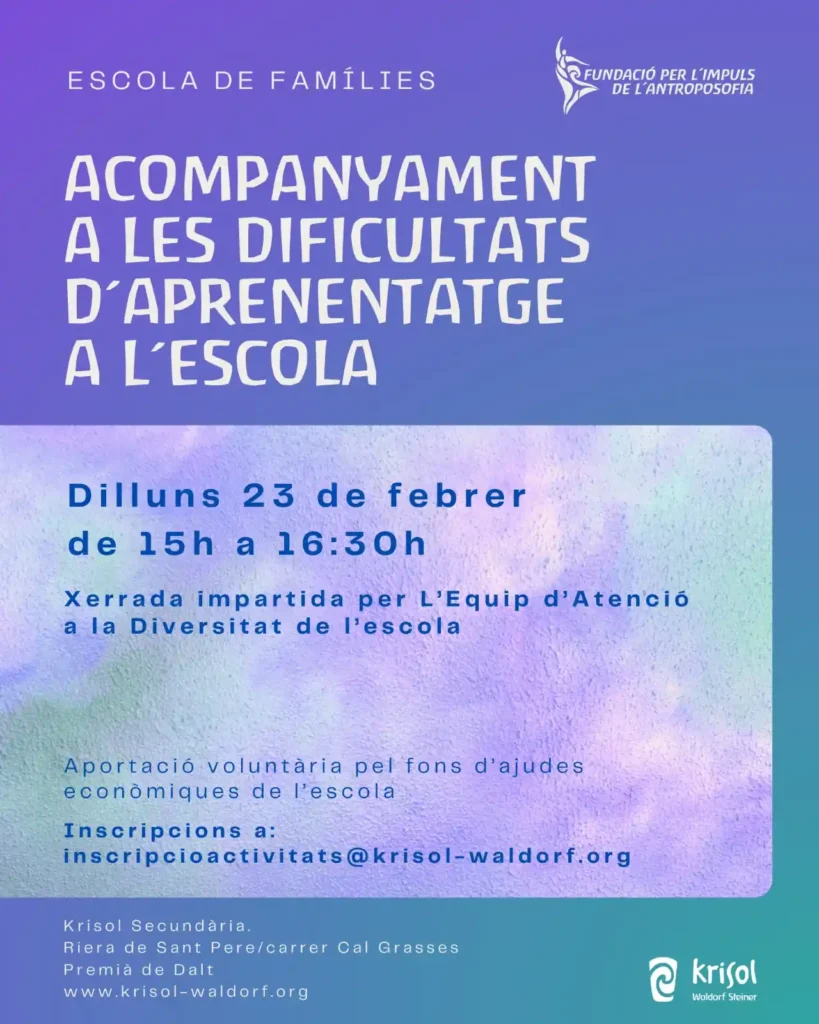 Desde el Equipo de Atención a la Diversidad de la escuela, os invitamos a una charla dedicada a la comprensión y el acompañamiento de las dificultades de aprendizaje en la infancia.